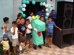 Lemon slaved away making a mascot outfit for the little cartoon character (“Zacapita”) which he had created for the Culture Center. He suckered a poor kid into wearing the costume promising fame and fortune. It turned out to be a success beyond our wildest fantasies. The kids went nuts every time he appeared which was pretty impressive for a costume made out of baloons and wire and cost less than US$3 to make.  |