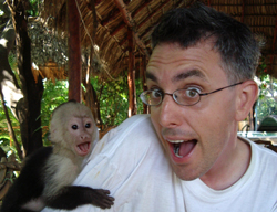 Nicaragua has a lot going for it. Among it’s fauna it boasts three species of monkeys (white-face, black-face and conger or howler) and we managed to see all three in their natural habitats at different times. During a stay at Los Felipes Hotel in Managua, a family of monkeys befriended us (we had little say in the matter). The male monkey called “Lorenzo” —we were told—enjoyed the occasional cigarette, and drank the gut-rotting local alcoholic brew known as “guaro”. The monkeys would come in our room (despite the no smoking sign) and bounce around on the beds and steal things. Other times they were more tranquil and just wanted to be hugged and you eventually had to prize them off with a crowbar and Vaseline.  |