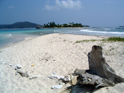 Sadly, even this remote paradise was afflicted with the sad vestiges of global capitalism and consumption. I began a cleanup campaign to rid the island of plastic drink bottles which appeared to comprise 95% of the flotsam and jetsam washed ashore by the daily tides. After eight sacks I had cleaned only a tiny fraction of the island. There must have been over 2000 bottles in total, tossed from the bows of cruise ships, abandoned by drunks to the tides, blown from the mainland trash heaps by storms and deliberately discarded by the evil “literati” of the world. A pox on all of them. And may the acrid black smoke from the burn pile end up depleting their own personal ozone layer.  |